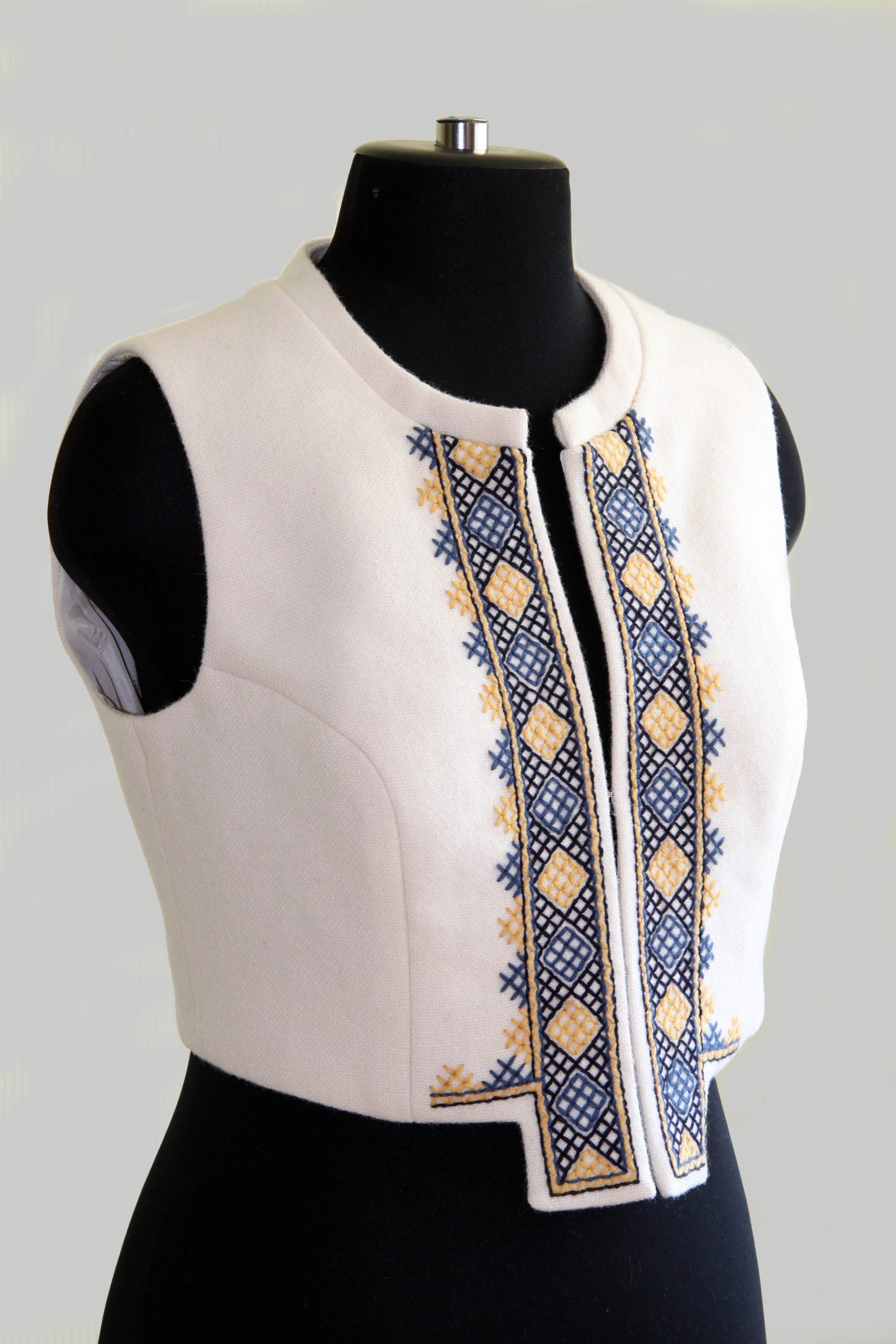 Balta vilnas auduma veste, izšūta aizdares daļa, aizdare ar āķiem.