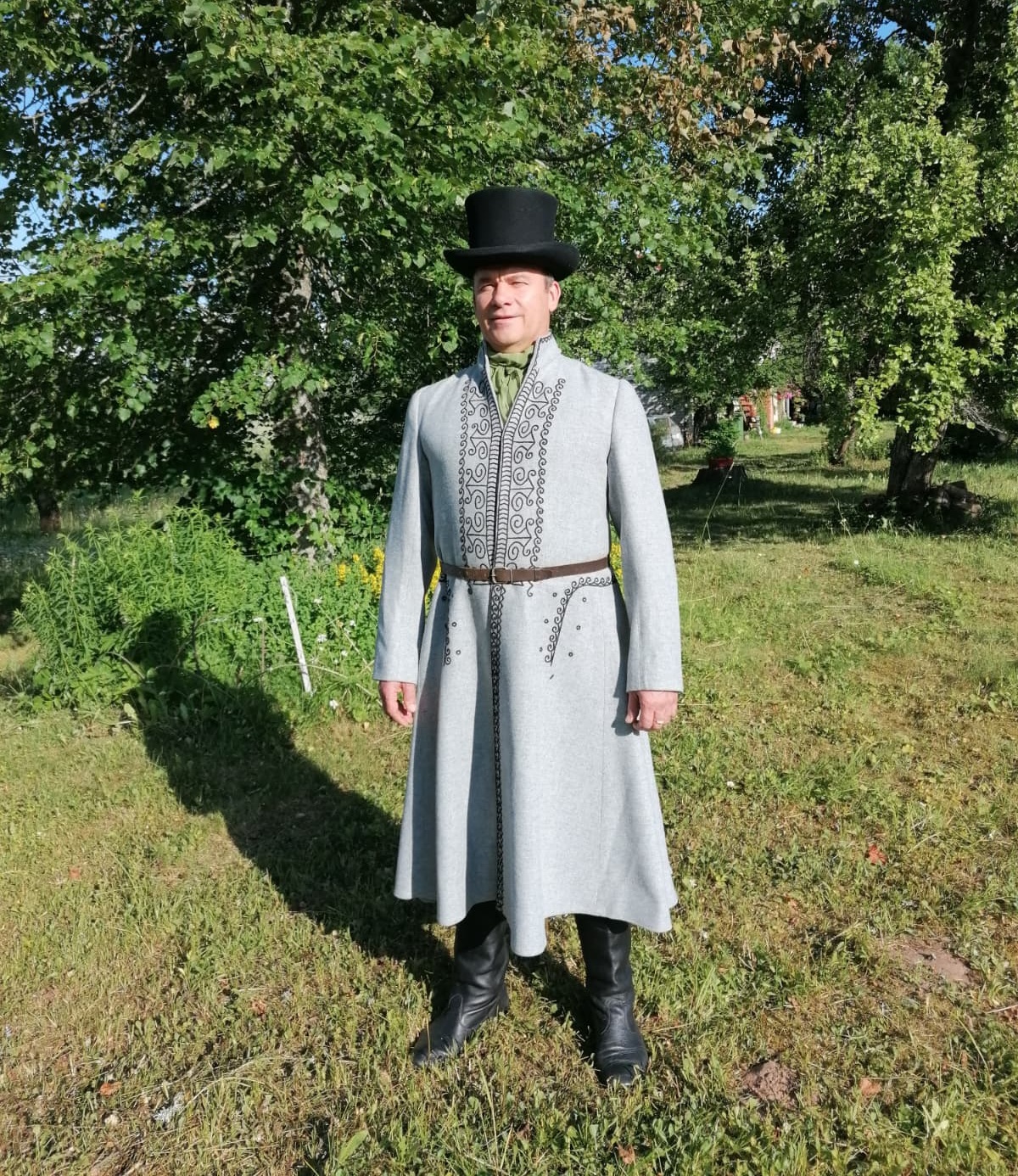 Pelēks vilnas auduma garais mētelis, papildināts ar bagātīgu izšuvuma rakstu un kupliem muduriem sānu daļā.