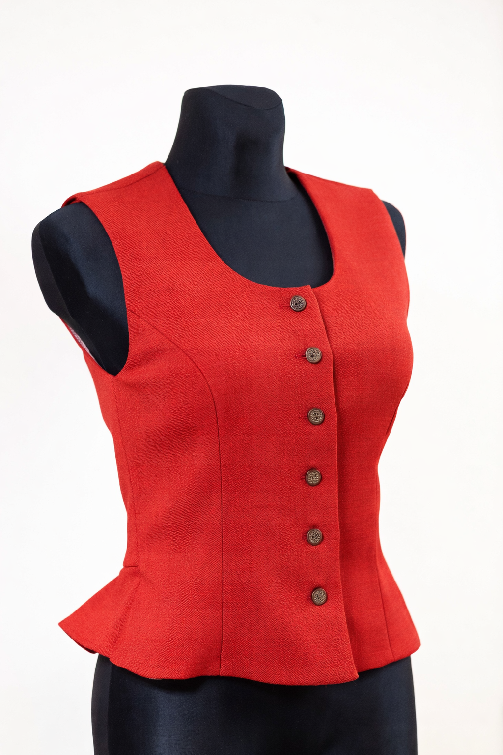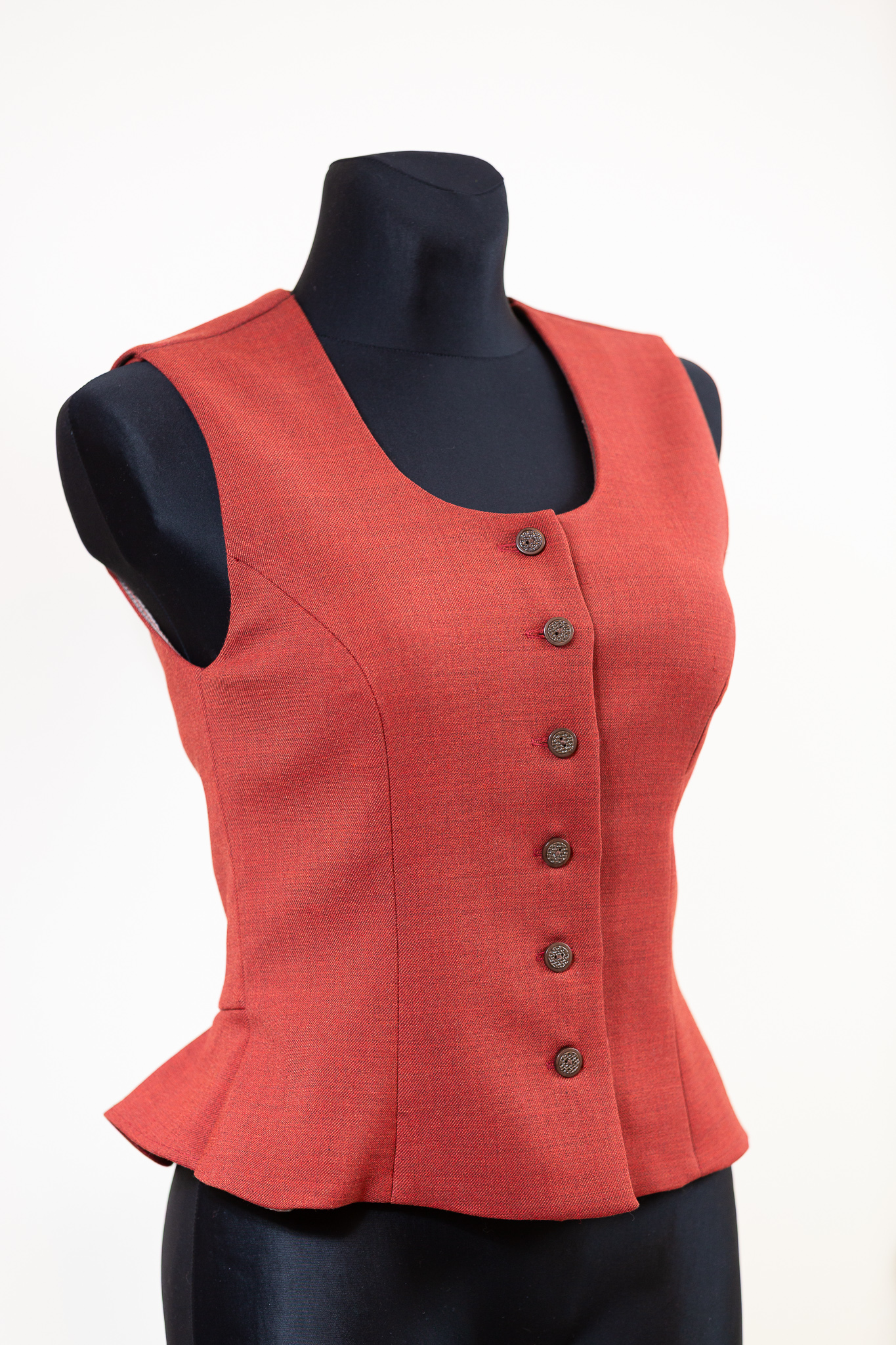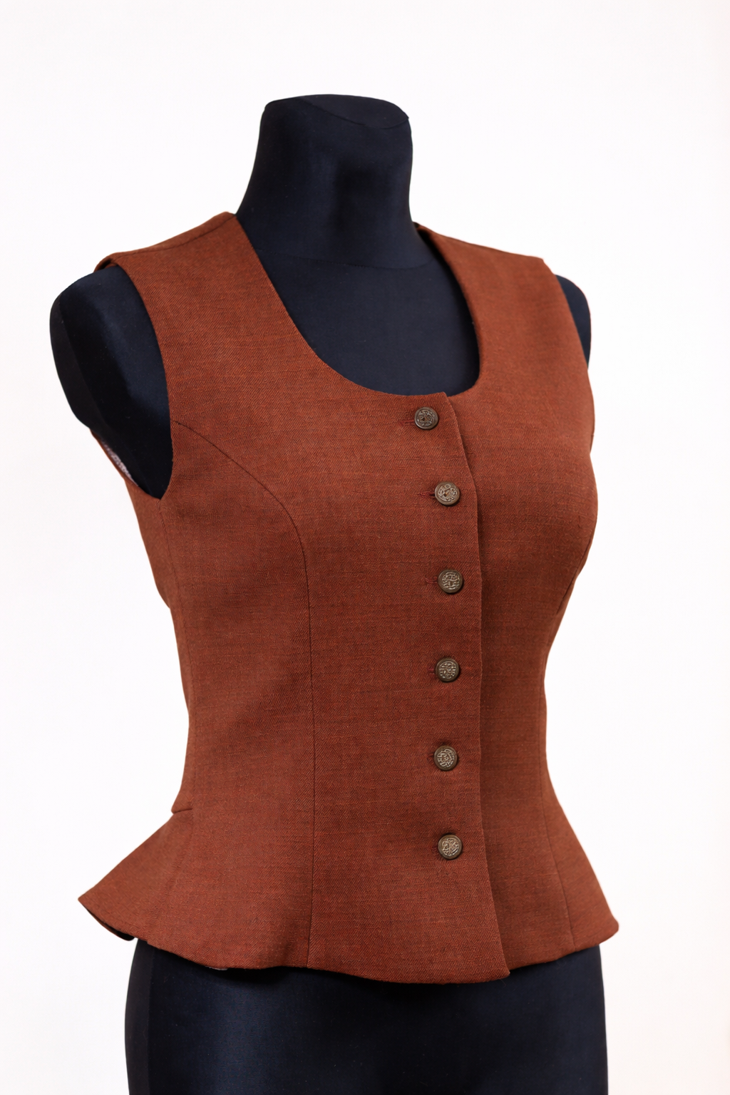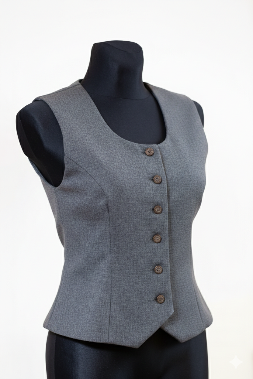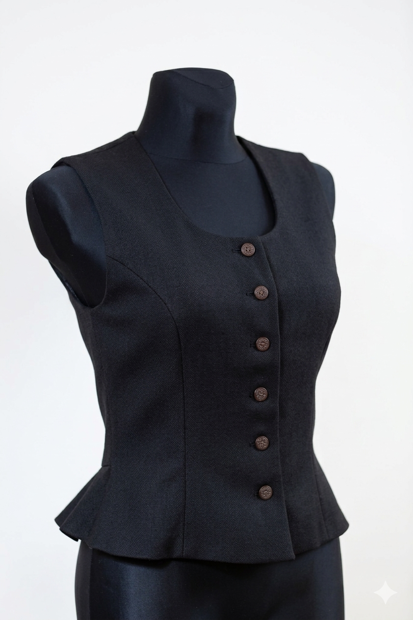 Pusvilnas auduma sieviešu tautiskā veste vai ņieburs ar 4 pretfaltēm muguras daļā, oderēta, aizdare ar pogām, regulējamas plecu un sānu vīles izmēra pielāgošanai.