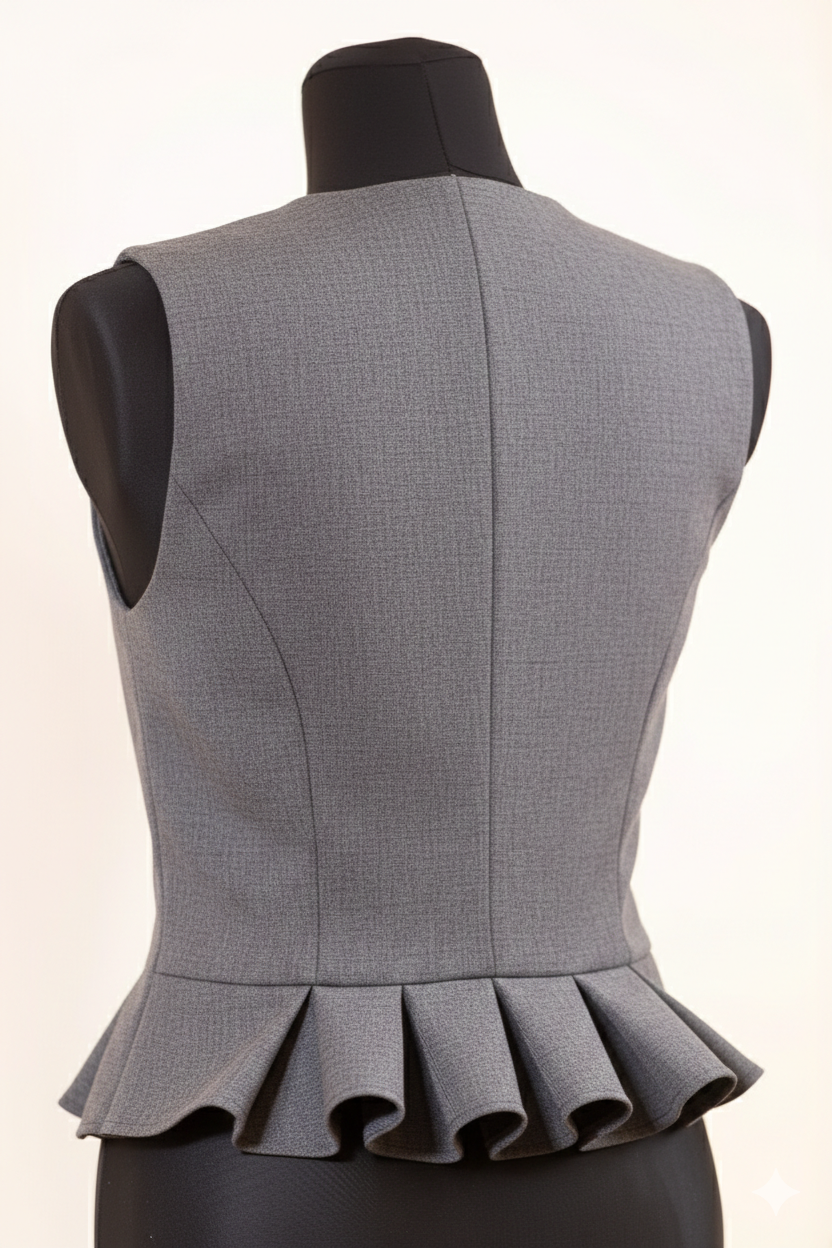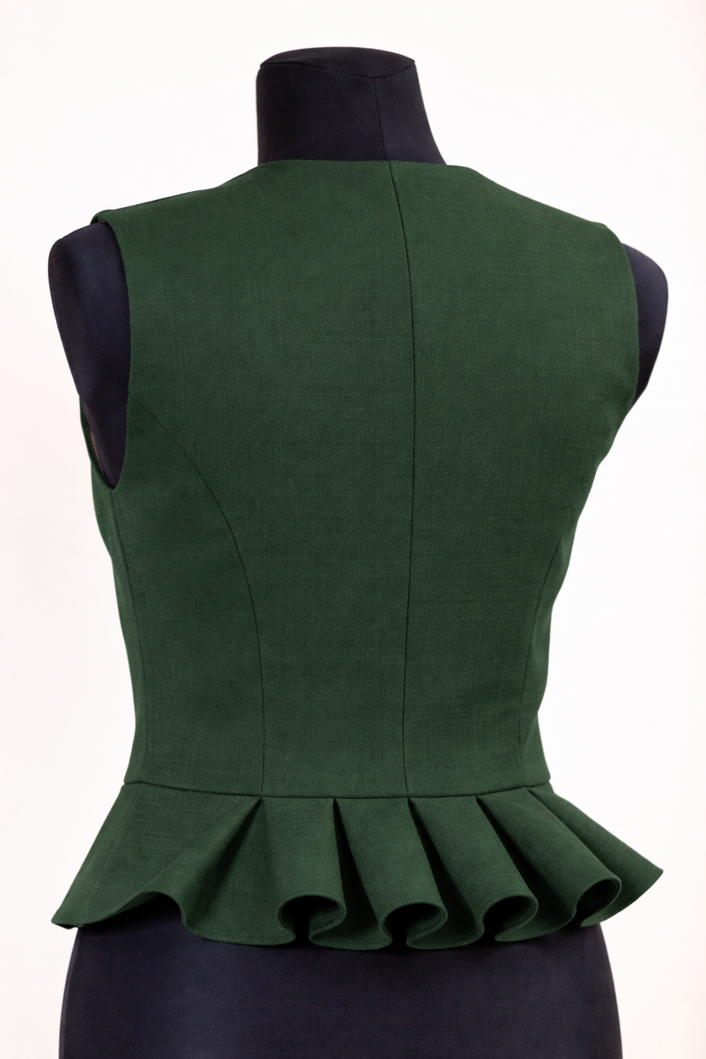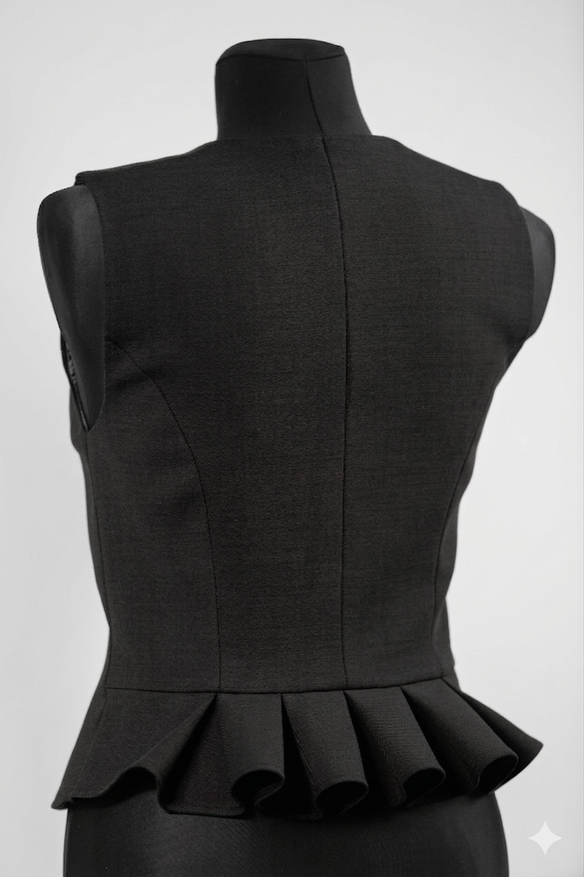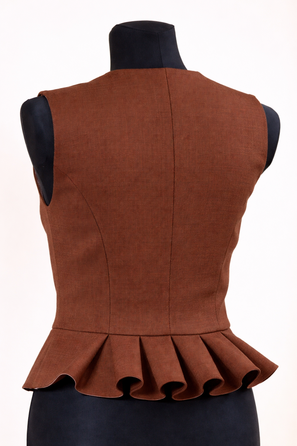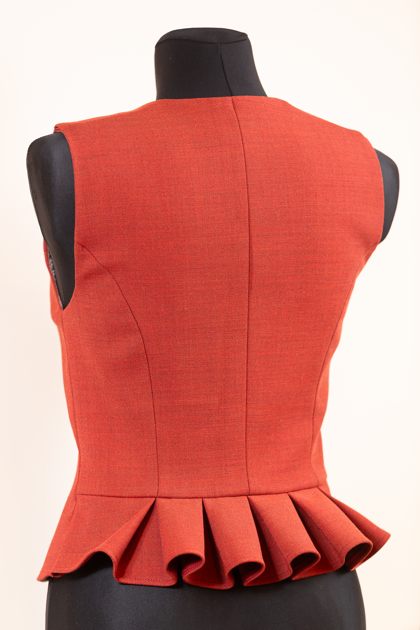 Pusvilnas auduma sieviešu tautiskā veste vai ņieburs ar 4 pretfaltēm muguras daļā, oderēta, aizdare ar pogām, regulējamas plecu un sānu vīles izmēra pielāgošanai.